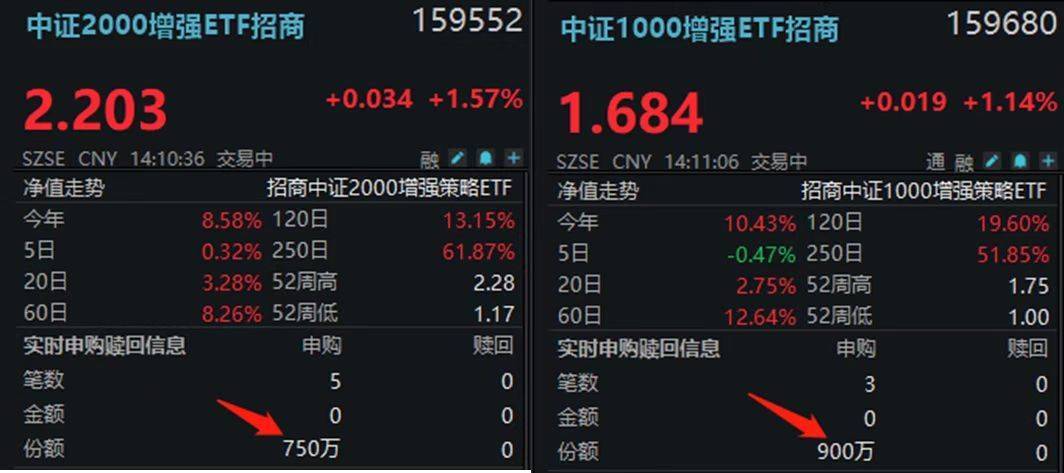 2月6日,A股市场迎来显著风格转换。中小盘风格强势回归,成为市场焦点。截至下午14时15分,1000ETF增强(159680)与中证2000增强ETF(159552) 盘中分别上涨1.32%和1.89%,在价格齐升的同时,也同步获得可观的资金净流入。